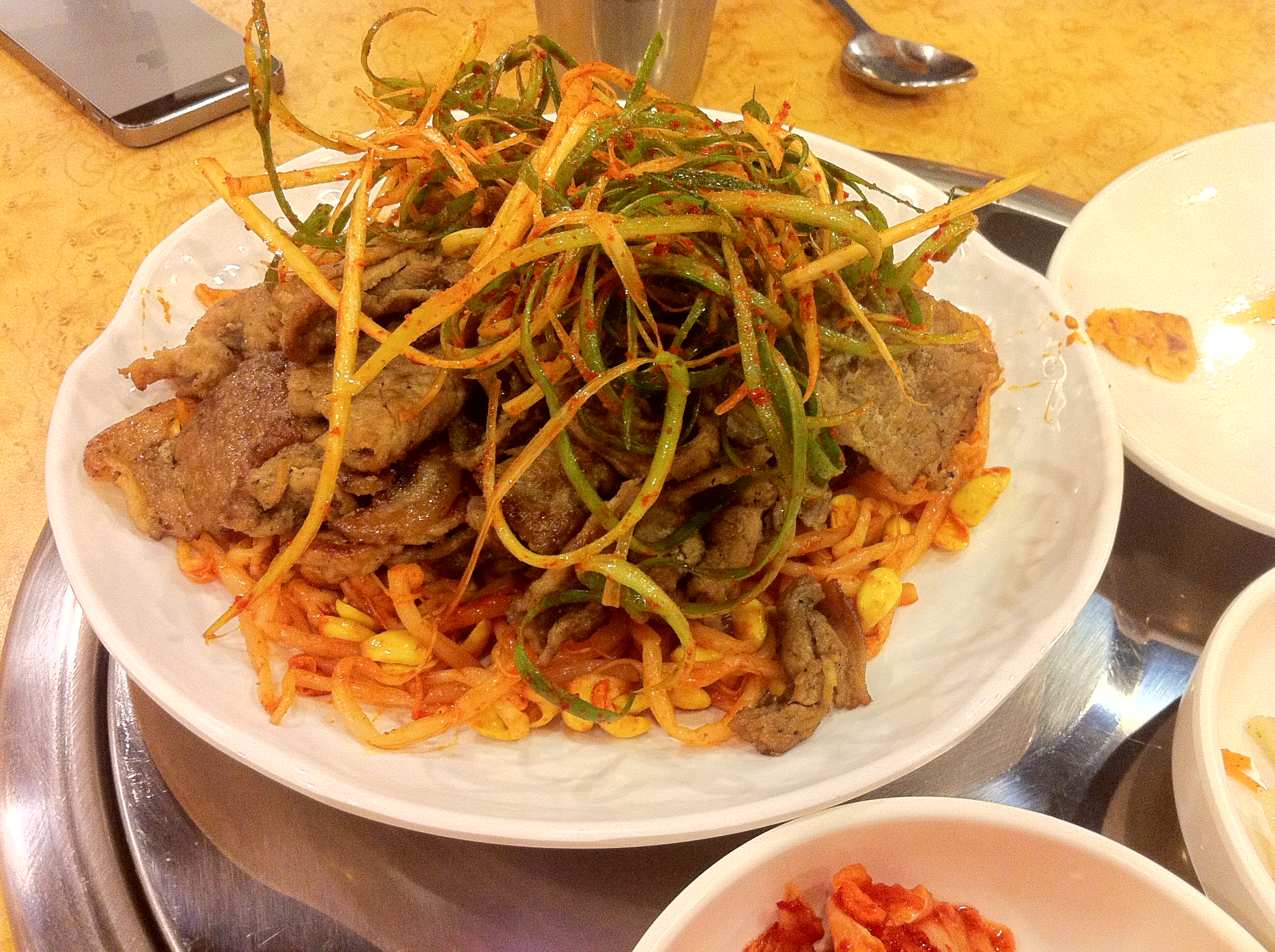 그리고 이게 그 석쇠불고기이다. 파와 고기, 그리고 콩나물의 조합