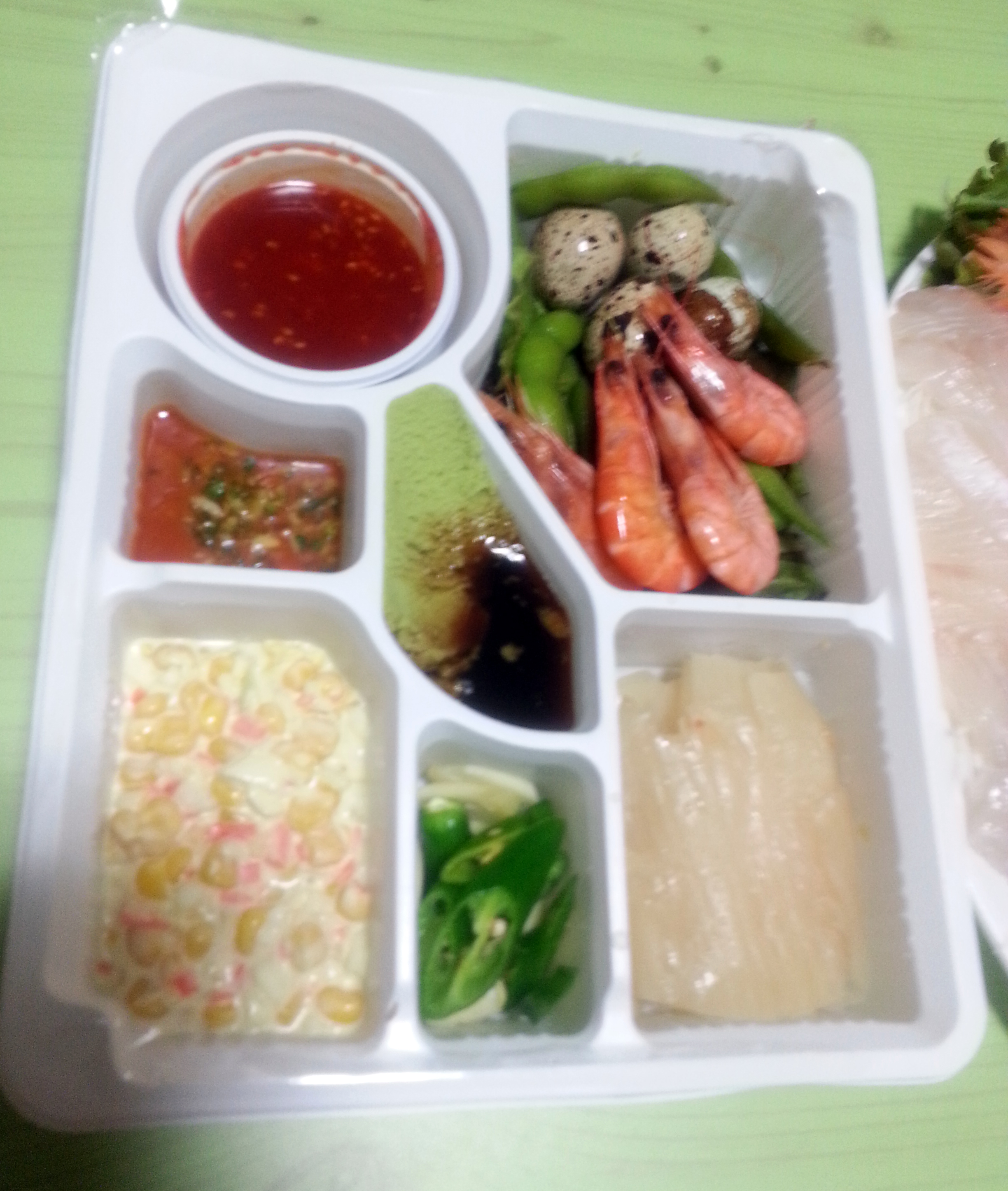 자.. 백김치, 쌈장, 된장, 콘, 고추, 마늘, 간장, 와사비, 새우, 완두콩, 메추리알 헥헥..