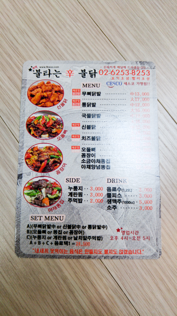 빛 때문에 잘 안 보이는데 무뼈닭발과 누룽지 등 주문하면 만원 중반대
